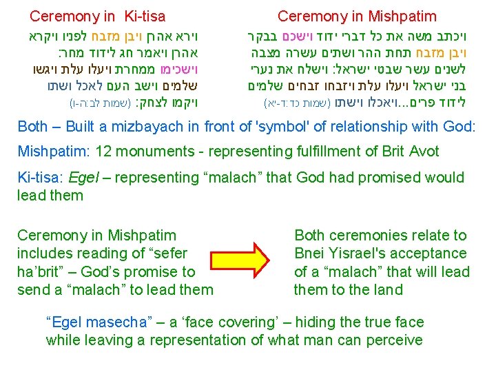 Ceremony in Ki-tisa וירא אהרן ויבן מזבח לפניו ויקרא : אהרן ויאמר חג לידוד מחר וישכימו ממחרת ויעלו עלת ויגשו שלמים וישב העם לאכל ושתו ( ו - ה : )שמות לב : ויקמו לצחק Ceremony in Mishpatim ויכתב משה את כל דברי ידוד וישכם בבקר ויבן מזבח תחת ההר ושתים עשרה מצבה וישלח את נערי : לשנים עשר שבטי ישראל בני ישראל ויעלו עלת ויזבחו זבחים שלמים ( יא - ד : ויאכלו וישתו )שמות כד. . . לידוד פרים Both – Built a mizbayach in front of 'symbol' of relationship with God: Mishpatim: 12 monuments - representing fulfillment of Brit Avot Ki-tisa: Egel – representing “malach” that God had promised would lead them Ceremony in Mishpatim includes reading of “sefer ha’brit” – God’s promise to send a “malach” to lead them Both ceremonies relate to Bnei Yisrael's acceptance of a “malach” that will lead them to the land “Egel masecha” – a ‘face covering’ – hiding the true face while leaving a representation of what man can perceive
