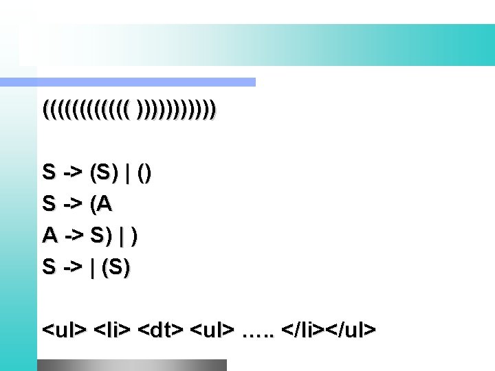 Eliminating Ambiguity (Cont. ) In most languages (including C++ and Java), each else is assumed to belong to the nearest if that is not already matched by an else. l This association is expressed in the following (unambiguous) grammar: l S Matched | Unmatched Matched if then Matched else Matched | Unmatched if then S | if then Matched else Unmatched