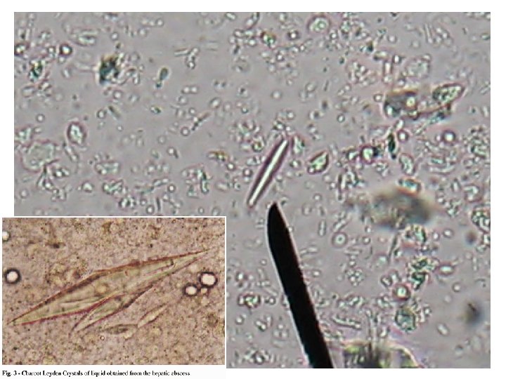 Restos no Parasitarios En material fecal también suelen encontrarse cristales: Cristales de oxalato de calcio cuya presencia en grandes cantidades puede significar una insuficiencia en el ataque gástrico (deficiencia en la secreción o tiempo de permanencia demasiado breve). Cristales de fosfato amónico-magnésico los que aparecen por contaminación de las heces por orina o putrefacción albuminoide. Cristales de Charcot-Leyden o agujas de brújula. Provienen de la destrucción de los eosinófilos y testimonian un estado alérgico de la propia mucosa intestinal sin estar necesariamente asociado a una hipereosinofilia sanguínea. También suelen aparecer células endógenas como los leucocitos, los que pueden observarse aislados con morfología conservada o alterados o en grupos denominados piocitos. En una materia fecal también se pueden encontrar hematíes y células epiteliales de distinto tipo. Las células del epitelio anal son poliédricas, alargadas, poco refringentes y con núcleo alargado u ovoide y gruesas granulaciones, mientras que otras células de la mucosa intestinal pueden aparecer redondeadas o alargadas. Sería imposible enumerar y reconocer todos los restos no parasitarios que pueden aparecer en una materia fecal y además muchos de ellos se destruyen apareciendo bajo la forma de detritus. Lo importante es saber que estos restos constituyen el fondo donde vamos a buscar a los verdaderos parásitos.