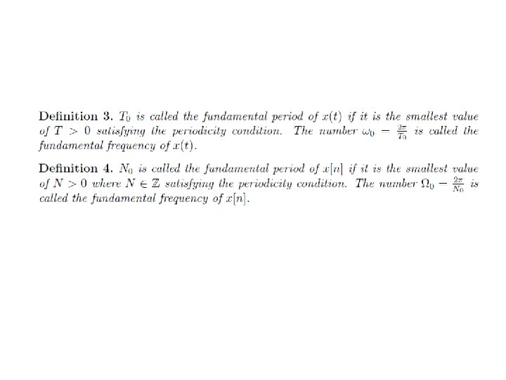 Periodic discrete-time signals are defined analogously. A sequence (discrete-time signal) x[n] is periodic with period N if there is a positive integer N for which ………. (1. 11) An example of such a sequence is given in Fig. 1 -4(b). From Eq. (1. 11) and Fig. 1 -4(b) it follows that ………. . (1. 12) for all n and any integer m. The fundamental period No of x[n] is the smallest positive integer N for which Eq. (1. 11) holds. Any sequence which is not periodic is called a non-periodic (or aperiodic sequence).