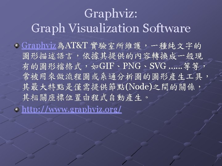 Syntax (3/3) Node的基本屬性 n node [n 1=v 1, n 2=v 2, …]; Edge的基本屬性 n edge [n 1=v 1, n 2=v 2, …]; 色彩的表示法 n n color = “#rrggbb” color = “red”