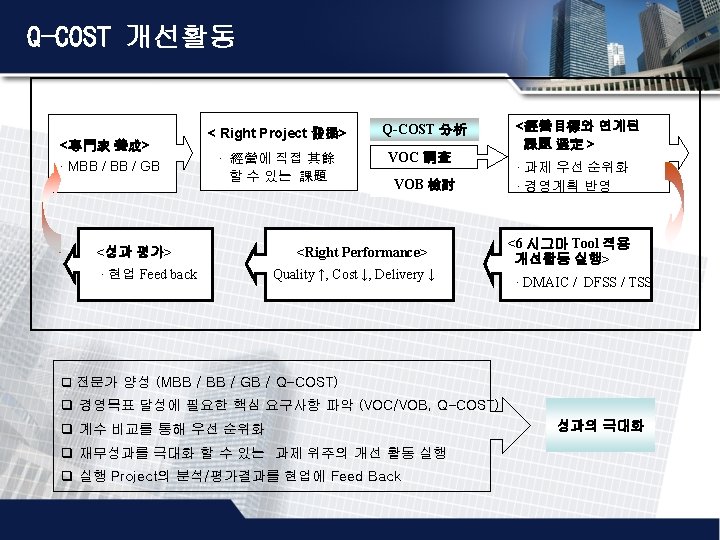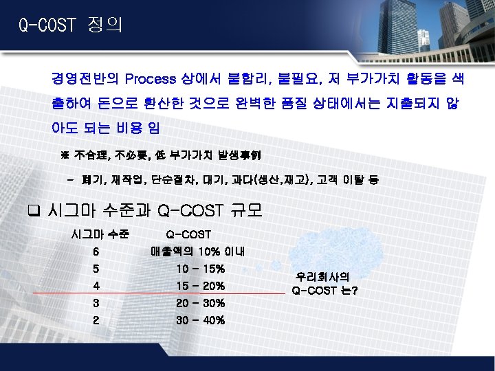 Q-COST 의 활동 범위 경영전략 사업전략 CTQ Big Y 1 Small Y (Project 1) Small Y (Project 2) Small Y (Project 3) CTQ 1 Big Y 2 Small Y (Project 4) Small Y (Project 5) Small Y (Project 6) Big Y 3 Small Y (Project 7) Small Y (Project 8) Small Y (Project 9) 제품전략 New Needs Customer Complaints Claim New Process Q-COST 규모규명 CTQ 2 RTY Process NVA Cycle Time ※ RTY : Rolled Throughput Yield (누적수율) NVA : None Value Added Work (비 부가가치 업무) CTQ : Critical To Quality (핵심요구사항)