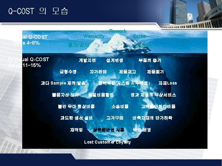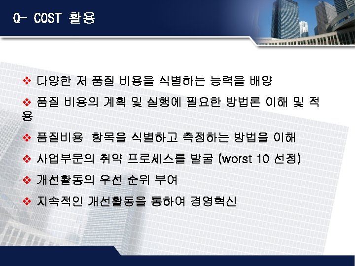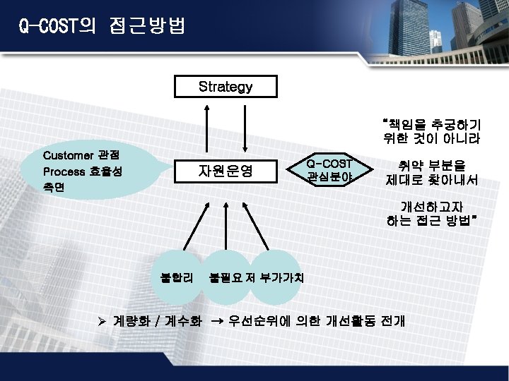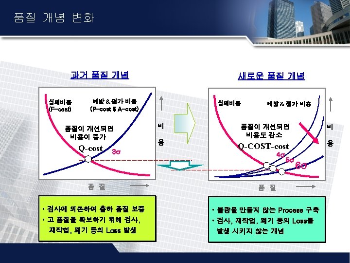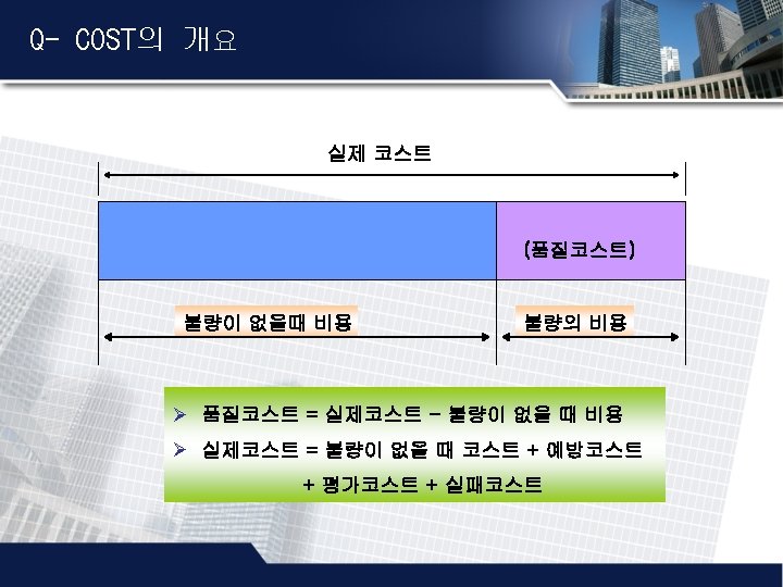 Q-COST의 분류 예방 비용 (Prevention Costs) 평가/검사 비용 (Appraisal/Inspection Costs) QCOST 내부실패 비용 (Internal Failure Costs) 외부실패 비용 (External Failure Costs) Q-COST Product, Market Oriented