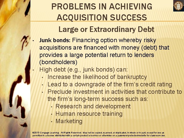 PROBLEMS IN ACHIEVING ACQUISITION SUCCESS Large or Extraordinary Debt • • Junk bonds: Financing option whereby risky acquisitions are financed with money (debt) that provides a large potential return to lenders (bondholders) High debt (e. g. , junk bonds) can: • Increase the likelihood of bankruptcy • Lead to a downgrade of the firm’s credit rating • Preclude investment in activities that contribute to the firm’s long-term success such as: • Research and development • Human resource training • Marketing © 2013 Cengage Learning. All Rights Reserved. May not be copied, scanned, or duplicated, in whole or in part, except for use as permitted in a license distributed with a certain product or service or otherwise on a password-protected website for classroom use.