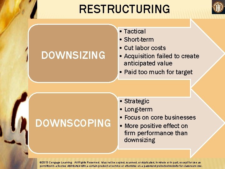 RESTRUCTURING Downsizing: a reduction in the number of a firm’s employees and sometimes in the number of its operating units • May or may not change the composition of businesses in the company’s portfolio Typical reasons for downsizing: • Expectation of improved profitability from labor cost reductions • Desire or necessity for more efficient © 2013 Cengage Learning. All Rights Reserved. May not be copied, scanned, or duplicated, in whole or in part, except for use as permitted in a license distributed with a certain product or service or otherwise on a password-protected website for classroom use.