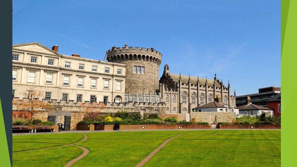 Dublin Castle, in the centre of the city, was built in the thirteenth century and is now used by the government of the Republic for various purposes and it houses the State Papers and Genealogical Office. Near this castle stands Trinity College. This university was founded by Queen Elizabeth I in 1591. Opposite Trinity College is the Bank of Ireland. This fine building was the Irish House of Parliament until 1800. Dublin is quite a lively city and the people take full advantage of the many opportunities for amusement. Cinema and Drama flourish in Dublin, the best known theatre is the Abbey Theatre where many world famous actors and actresses have begun their careers. Dubliners also have the Phoenix Park which has a circumference of 7 miles. It contains a zoo and open spaces with fields to play football, cricket and polo and it also houses the official residence of the President of the Republic. At present, His Excellency Michael D Higgins, elected on 29 October 2011 is the incumbent President.