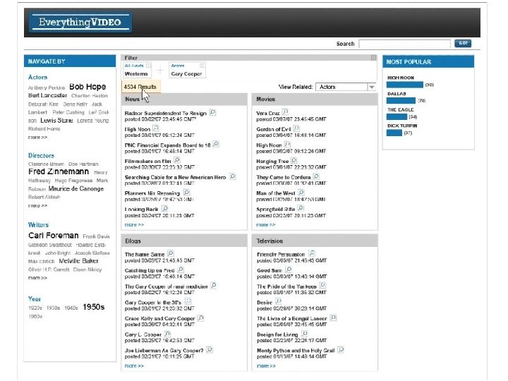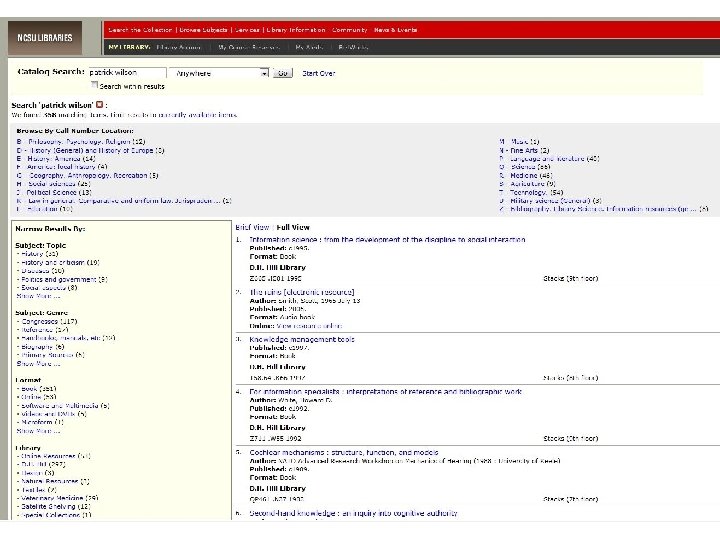 Facets reinterpreted… Information architecture and ‘faceted’ OPACs (Endeca for example) have reinterpreted facets. Some call this “relational search” where they break apart all aspects of the data, and group it into ‘categories’ Others consider a facet to be any attribute where the values are under authority control (e. g. , controlled subjects = yes; uncontrolled keywords = no)