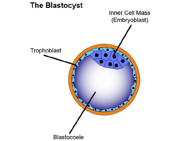 Cleavage and Implantation • 16 cells = Morula - which reaches the uterus 3 -5 days after fertilization • Morula fills with fluid from the uterus and develops into a blastocyst • Blastocyst is made up of two types of cells: – Trophoblast – Inner cell mass