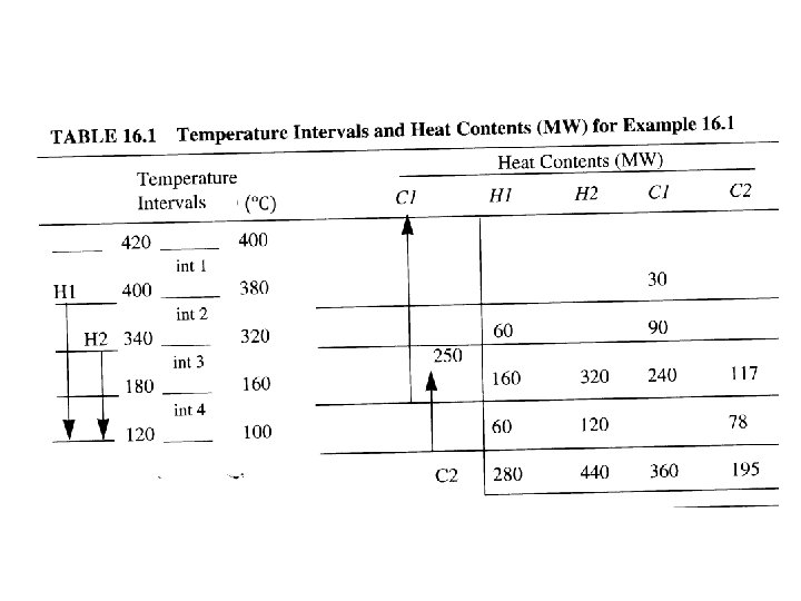 Example 1 Fcp (MW/C) Tin (C) Tout (C) H 1 1 400 120 H 2 2 340 120 C 1 1. 5 160 400 C 2 1. 3 100 250 Steam: 500 C Cooling water: 20 – 30 C Minimum recovery approach temperature (HRAT): 20 C