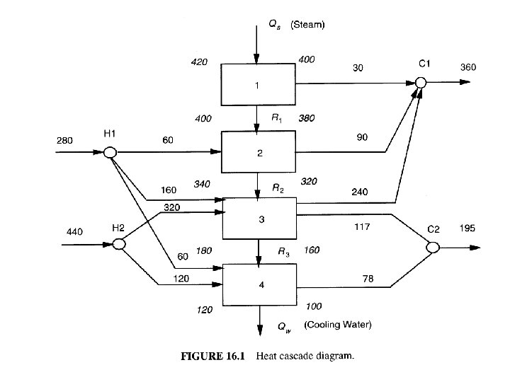 Example 3 Stream Tin (K) Tout (K) Fcp (k. W/K) Heat Load (k. W) h (k. W/m^2 K) Cost ($/k. Wyr) H 1 440 350 22 1980 2. 0 - C 1 349 430 20 1620 2. 0 - C 2 320 368 7. 5 360 0. 67 - S 1 500 - 0 120 W 1 300 320 - 0 1. 0 20