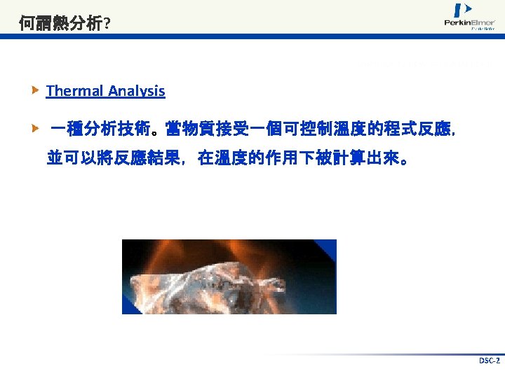 熱分析技術客戶訓練 Part I : DSC Perkin. Elmer SVC Engineer 蔡傳盛 Sam Tsai Sam. tsai@perkinelmer. com
