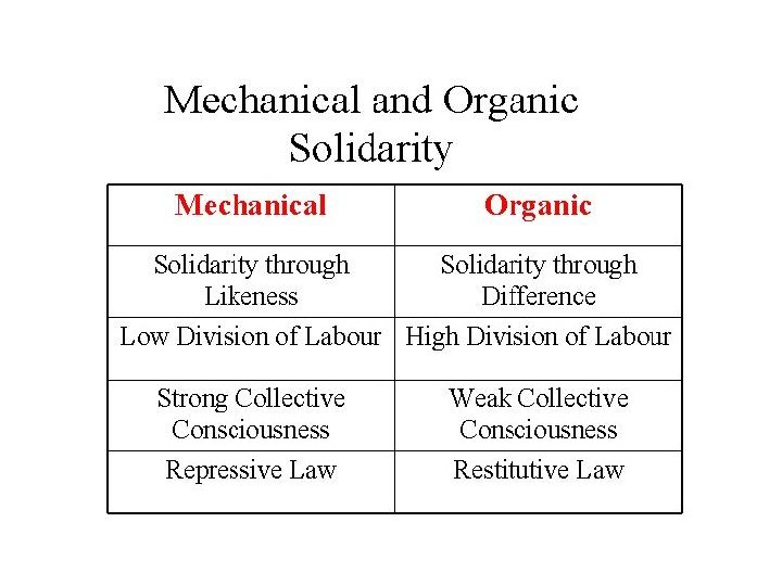 “Mechanical Solidarity”: Repressive, penal punishment These early societies followed a “morphological pattern”: Small population + low demographic density + large territory + use of primitive technology to extract resources = “Mechanical Solidarity” Such societies get segmented into even smaller, very similar subunits which subsist by embodying the same culture and interacting with the others on ritual occasions, which renew everyone’s feeling of “togetherness. ” These societies are homogenous and have no major fissures to be mended.