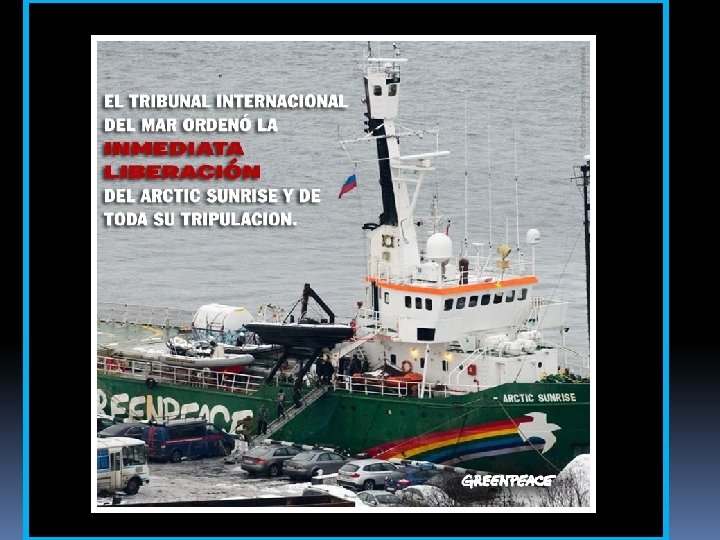 MV Arctic Sunrise Rompehielos y buque de investigación de Greenpeace. (pabellón holandés) ü 19/09/13: protesta contra la plataforma de extracción de petróleo de Gazprom (empresa Rusa) en el Ártico. ü los activistas fueron puestos en prisión preventiva. El gobierno holandés, exigió la inmediata liberación del buque y de los 30 activistas y su tripulación. ü 23/10/13: Holanda presentó al Tribunal de Hamburgo una demanda exigiendo que Rusia permita al Arctic Sunrise abandonar sus aguas territoriales, libere a los tripulantes, suspenda las diligencias administrativas y judiciales abiertas contra ellos y se abstenga de cualquier otra acción. üFallo: 22/11/13: A favor de Holanda en materia de “liberación” y 3. 600. 000 EU.