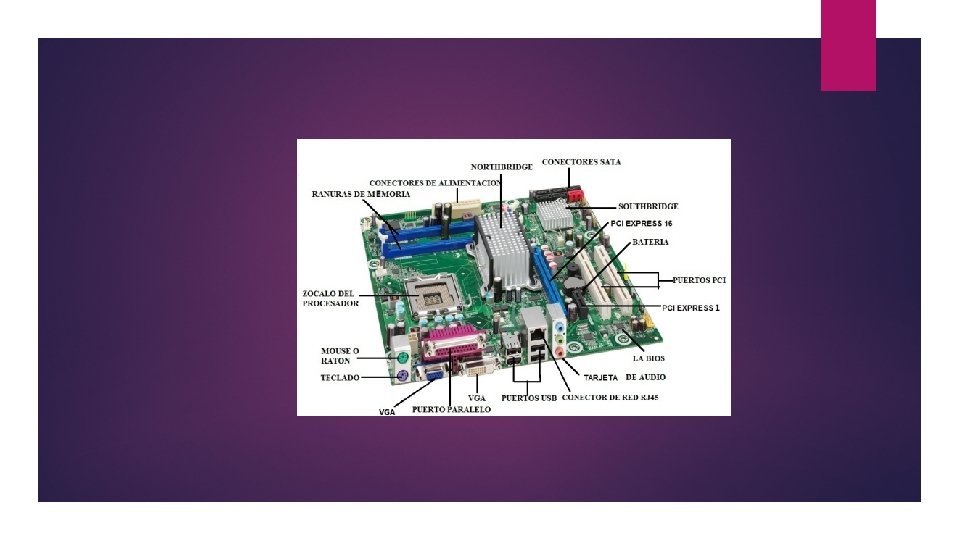 Puerto paralelo Estas partes de la tarjeta madre, se encuentran para hacer posible la conexión de otros aparatos como lo es el monitor de pantalla de la computadora, así como de escaneres, impresoras, y en algunas ocasiones del pasado eran también para el teclado actualmente la conexión es por usb.