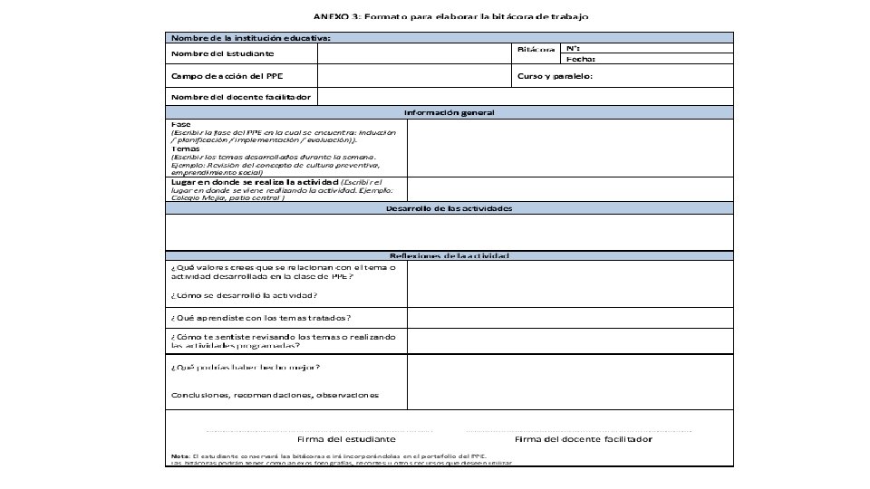 Garantizar el cumplimiento de la carga horaria semanal del PPE (Acuerdo Ministerial Nro. MINEDUC-ME-2016 -00040 -A, 2016); considerando que de las 30 horas pedagógicas de la jornada laboral docente (al interior del establecimiento educativo) según el Reglamento General a la Ley Orgánica de Educación Intercultural (RLOEI, 2012), se asigne a los docentes facilitadores el equivalente a las 5 horas reloj para las actividades semanales con los estudiantes del PPE.