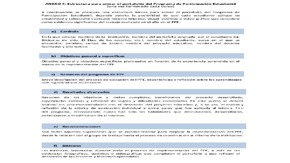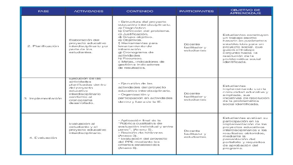 4 Fase de evaluación En esta fase se valorará la participación del estudiante, el acompañamiento del docente facilitador y los resultados finales del proyecto educativo interdisciplinario. El objetivo de la fase de evaluación es determinar el logro de las competencias tanto en el estudiante como en el docente; además, la presentación escrita del proyecto, el cumplimiento del cronograma y la participación en las actividades por parte de los estudiantes. Es importante recalcar que la evaluación como fase del PPE, se encuentra ubicada al final del proceso, a fin de que se convierta en un espacio específico de consolidación del aprendizaje y que canalice el cumplimiento de los requisitos de aprobación de los estudiantes que llevará a obtener el criterio cuantitativo y/o cualitativo requerido (revisar el acápite 11 del presente documento). Sin embargo, la evaluación como desarrollo, es un acto sistemático y continuo a lo largo de todas las fases del PPE e implica que tanto los estudiantes como el docente, valoren y resignifiquen la adquisición gradual de competencias en función de la meta conjunta que el equipo definió para la resolución de la problemática social identificada; considerando entonces a la evaluación como transversal al PPE, se debe considerar: el portafolio (Anexo 4), la presentación de bitácoras de trabajo (Anexo 3), la rúbrica cualitativa de evaluación individual y entre pares (Anexo 5) y la rúbrica de calificación del desarrollo e implementación del proyecto educativo (Anexo 6) y demás actividades y estrategias definidas por el docente facilitador. Esta fase tiene una duración de 8 horas.