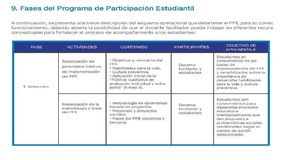 Fase de inducción Es el momento en el que el docente facilitador informa de manera concreta a los estudiantes, tanto de primero como de segundo curso de bachillerato: el objetivo del PPE, la normativa vigente para su cumplimiento, los ejes transversales del programa, la metodología de trabajo, y el cronograma a cumplir. Esto con la finalidad de que los estudiantes contextualicen el por qué y para qué del tiempo que van a invertir en el PPE, se empoderen de su rol activo en la transformación social y generen estrategias innovadoras de resolución de problemáticas sociales. La implementación de la fase de inducción se llevará a cabo de acuerdo al siguiente cronograma: