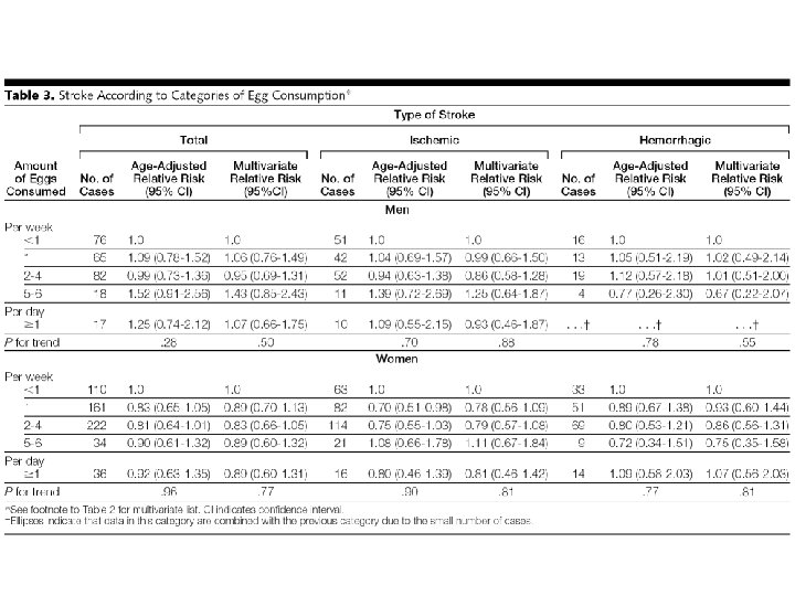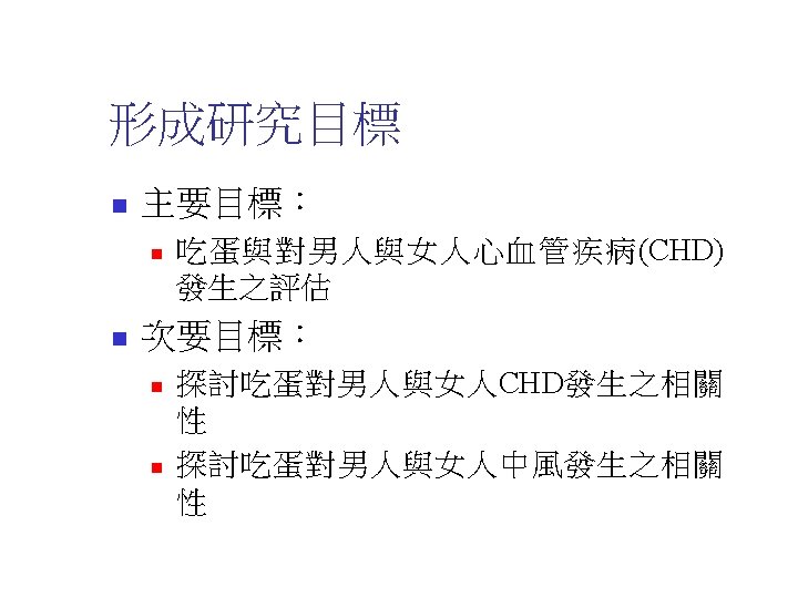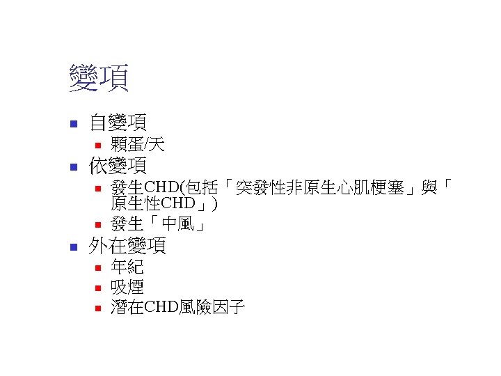 標準 n 吃蛋頻率分二大項 n n 1 per week, 2 -4 per week, 5 -6 per week, ≥ 1 per day 發病 n n Yes, No The relative risks (RRs) were calculated by dividing the incidence of CHD or stroke among men and women in various categories of egg consumption by the incidence among those in the lowest category of intake ( ≤ 1 egg per week), adjusting for age (5 -year categories).