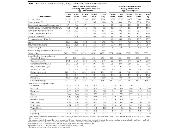 Assessment of Egg Consumption n Validated dietary questionnaires were sent to the HPFS participants in 1986 and 1990 and the NHS participants in 1980, 1984, 1986, and 1990. In all the questionnaires, we asked the participants how often, on average, during the previous year they had consumed eggs (unit of consumption was 1 egg). Nine responses were possible, ranging from never to 6 or more times per day. We divided the participants into 5 categories ( ≤ 1 per week, 2 -4 per week, 5 -6 per week, ≥ 1 per day) based on the frequency distribution of egg consumption. In a validation study in a subsample of the participants, the correlation coefficent between intakes of eggs assessed by the diet questionnaire and by multiple week diet records was 0. 8 for both men and women. We also computed intake of eggs included in other foods such as cakes, cookies, pancakes, muffins, sweet rolls, and donuts. The amount of eggs estimated from other foods was relatively small in both cohorts (men, 0. 4 egg per week; women, 0. 3 egg per week), so we used the reported egg consumption as our primary exposure variable. In a secondary analysis, we examined the effect of computed total egg consumption.
