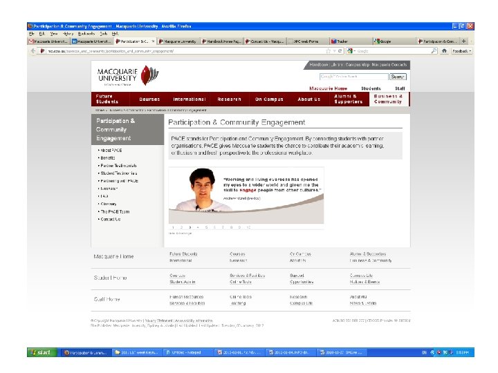 roll-out of Participation at macquarie • staged implementation of PACE over the next 4 years • from 2012: Ø participation unit a core requirement in some 31 degree programs (about half of the total number of degrees), and 8 majors/streams Ø a range of other participation activities open to all students via Faculty and Departmental Participation units (electives) Ø. . . currently a total of 29 participation units accredited by ASQC/Senate 14