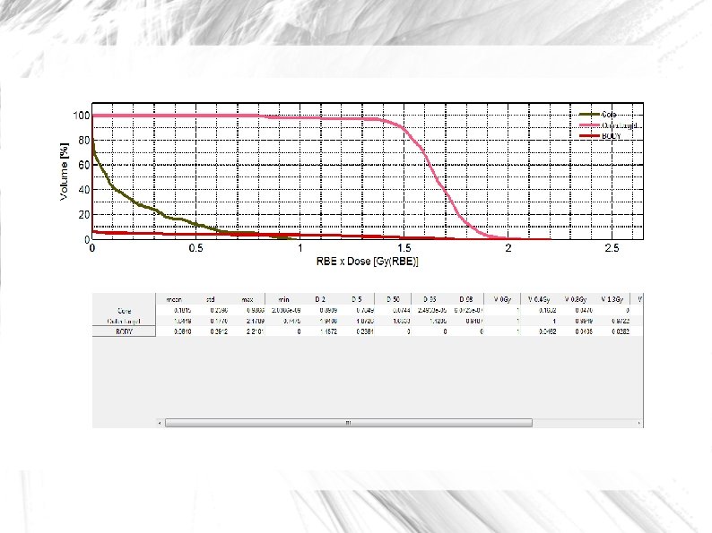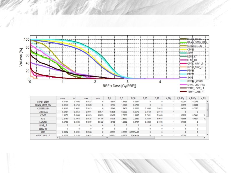 Results Mean doses for diferent regions (Gy) using three proton beams, with and without patients movement: Region/Iso-center Without movement With movement Brain Stem 0. 2645 0. 5784 Cerebellum 0. 6355 0. 9112 CTV 63 2. 1304 1. 9376 GTV 2. 3305 2. 2150 Lenses (L, D) 0, 0 Skin 0. 4682 0. 4555 Optic Nerv (L, D) 0, 0 0. 0775, 0. 0092 Spinal Cord 0. 6268 0. 7466 PTV 63 2. 1092 1. 8369 PTV 70 2. 3102 2. 1671