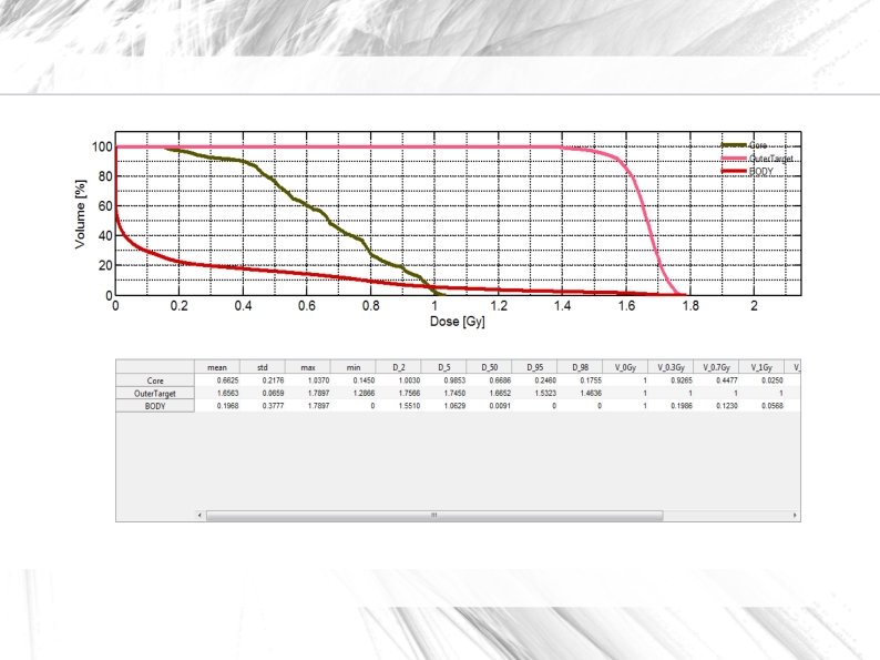 Results Mean doses for different regions (Gy): Region/Radiation(angles) Photons(0) Protons(0) Photons (0, 72, 144, 216, 288) Core 1. 0665 0. 1815 0. 6625 Outer Target 1. 5852 1. 6449 1. 6563 Body 0. 1443 0. 0640 0. 1968 Treatment plan using multiple photon beams gives better results than single photon beam. Best results are obtained using protons.