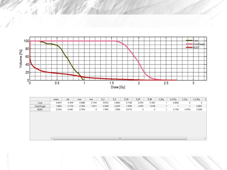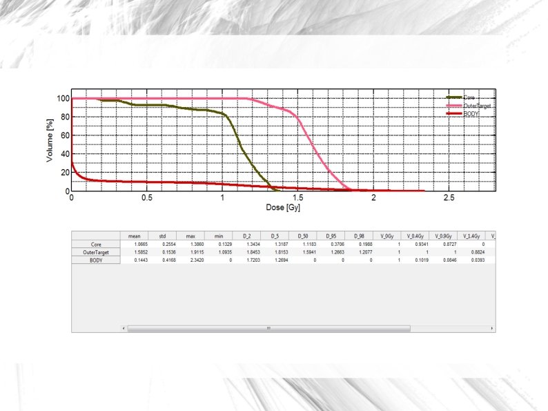Results Mean doses for different regions (Gy) using 5 beams with and without constraints: Region/Radiation With constraints Without constraints Core 0. 6625 0. 6974 Outer Target 1. 6563 1. 9652 Body 0. 1968 0. 2343
