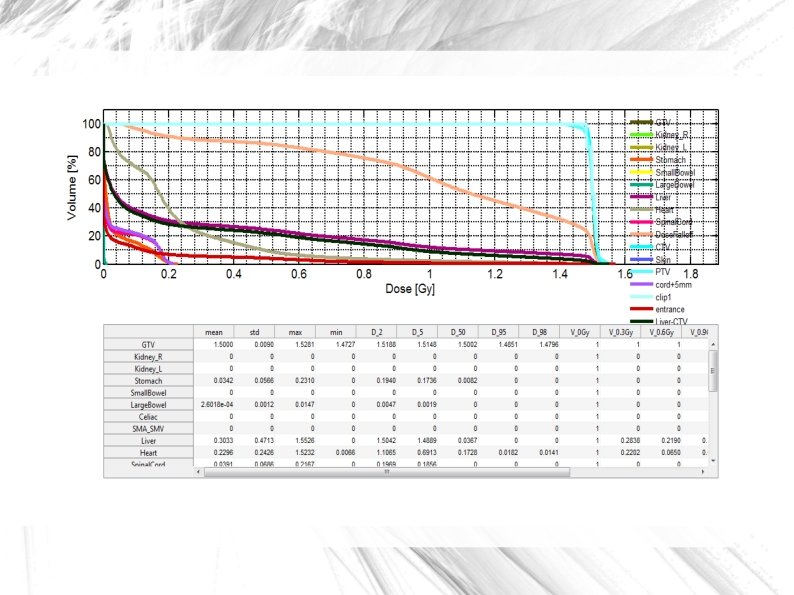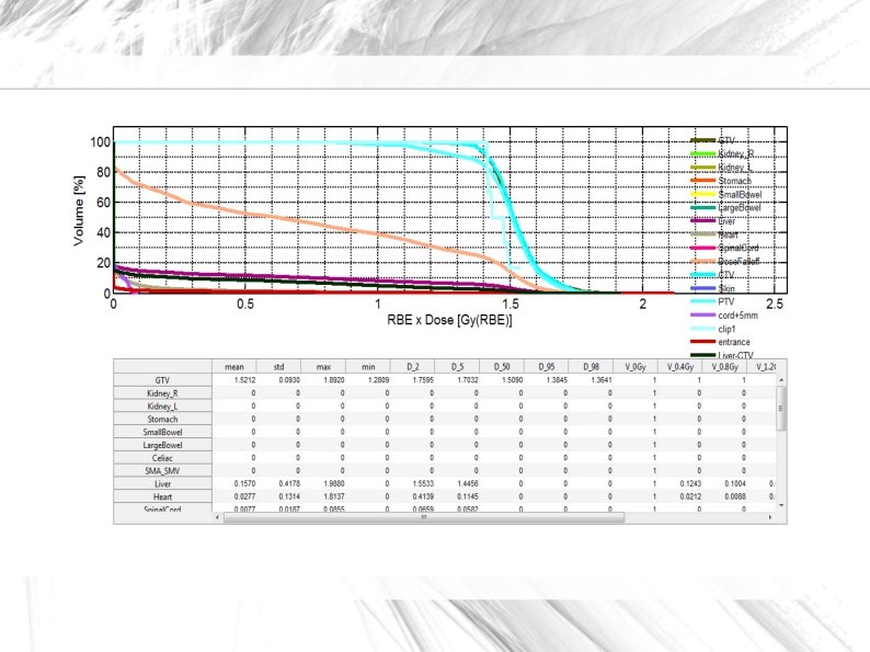 Results Mean doses for different regions (Gy) using 5 photon beams, sigle proton beam and carbon ion beam: Region/Radiation( Photons(0, 180, 22 angles) 5, 270, 315) Protons(315) Carbon(315) GTV 1. 5053 1. 5212 Kidneys 0 0 0 Stomach 0. 0342 0 0 Liver 0. 3033 0. 1694 0. 1570 Heart 0. 2296 0. 0172 0. 0277 Spinal Cord 0. 0391 0 0. 0077 CTV 1. 5015 1. 4981 1. 5236 PTV 1. 4991 1. 4595 1. 4868 Skin 0. 0568 0. 0179 0. 0162