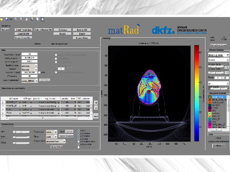 5. Define your own proton treatment plan with one beam from e. g. 315°. Then trigger dose calculation („Calc. Influence Mx“) and start inverse optimization („Optimize“).