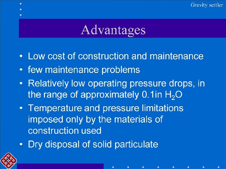 Scrubbers Advantages: Good efficiency, can collect (potentially explosive) gaseous pollutants as well as PM, small size Disadvantages: Requires a lot of water, generates waste stream