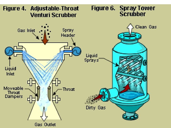 Type 3: Scrubbers Specific types include: • Venturis • Ejector • Impingement and Sieve • Mobile Bed Plates • Spray Towers • Catenary Grid • Mechanically Aided • Froth Tower • Condensation Growth • Oriented Fiber Pad • Packed Beds • Wetted Mist Eliminators