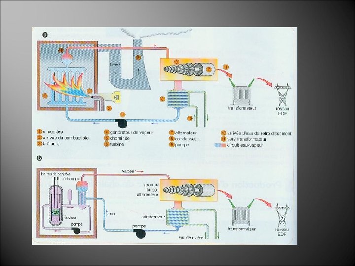 3 - Quel est le point commun entre la centrale thermique à flamme et la centrale nucléaire ? Utilisation de la vapeur d’eau pour faire tourner la turbine. 4 - La vapeur produite dans une centrale nucléaire est- elle en contact avec les produits radioactifs ? Non, les circuits primaire et secondaire sont complètement séparés. De plus, le fluide calorifique du circuit primaire n’est pas en contact avec les produits radioactifs.