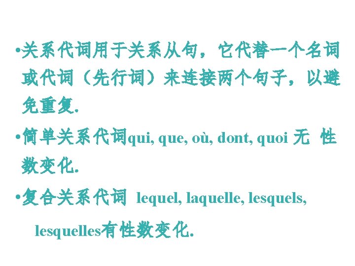 • 还可以代替指人的先行词,在从句中做间宾,状 语,名词补语或形容词表语等,但须置于介词之后。 • Eg : Le journaliste à qui je parle est très gentil. Voilà la copine avec qui je vais souvent au café. C’est une fille en qui on peut avoir confiance.