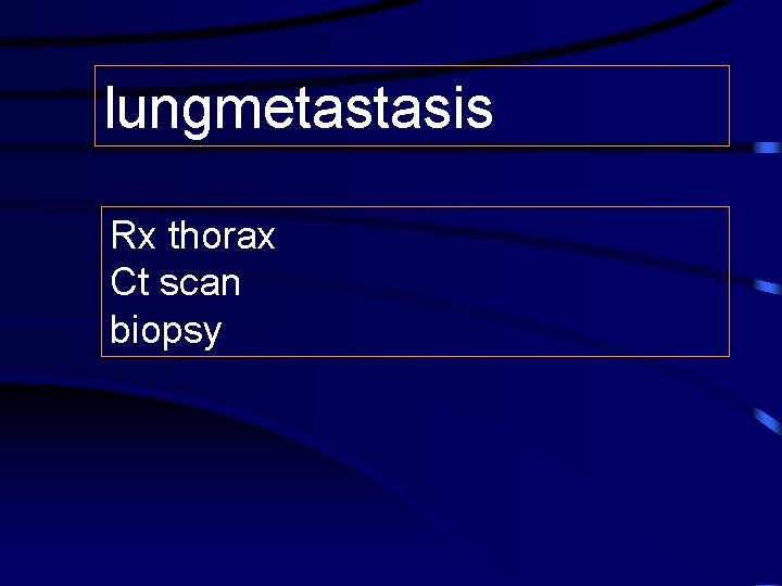 Meimarakis et al. (2013) performed a prospective trial in 81 MBC patients who underwent a ressection of longmetastasis. In their study other factors were included: size of metastase (mediane survival if metastase <3 cm: 103. 4 months versus 39. 1 months if >3 cm) hormone receptor positivity (median survival if positive 127 months versus 27 months if negative Reported mortality after resection of lung metastasis is 01% , the morbidity is 0 -13% in different studies. Hersenmetastasen CT