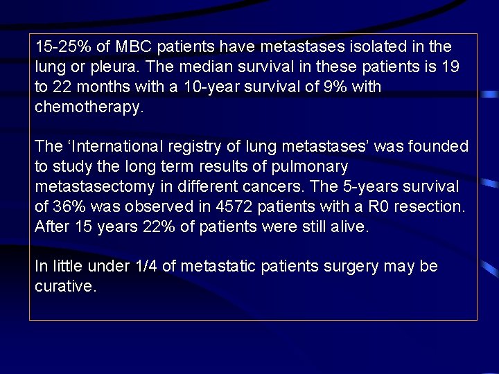 15 -25% of MBC patients have metastases isolated in the lung or pleura. The median survival in these patients is 19 to 22 months with a 10 -year survival of 9% with chemotherapy. The ‘International registry of lung metastases’ was founded to study the long term results of pulmonary metastasectomy in different cancers. The 5 -years survival of 36% was observed in 4572 patients with a R 0 resection. After 15 years 22% of patients were still alive. In little under 1/4 of metastatic patients surgery may be curative.