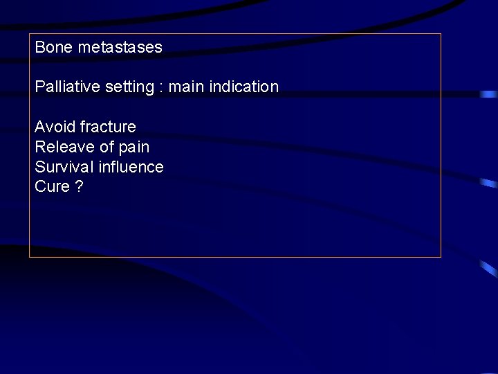 Bone metastases Palliative setting : main indication Avoid fracture Releave of pain Survival influence Cure ?