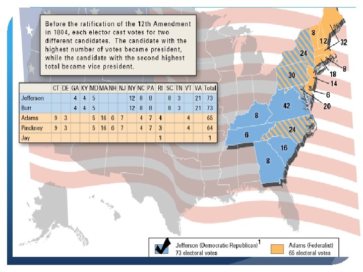 The Election of 1800 Re-match of Election 1796 (Adams vs. Jefferson) Main issues: Relations with France and Alien/Sedition Acts This election is seen as the first modern campaign: 1) Organized political parties to “get out the vote” 2) Negative advertising 3) Extreme bitterness between parties/candidates Controversy: Since Constitution never envisioned political parties, it made no provision for a separate ballot for the President and Vice-President (the second place vote winner would become the VP). This caused a problem when Jefferson and his VP Burr ended up in a tie for President. The Federalists in the House of Representatives made it difficult to settle this election.