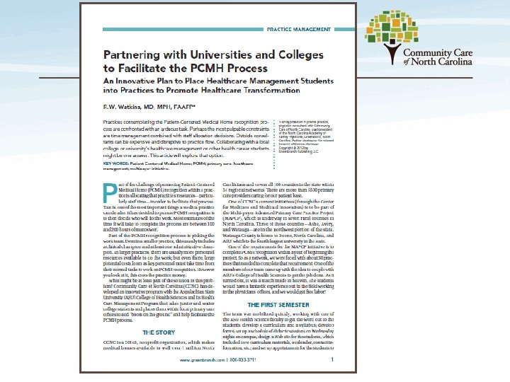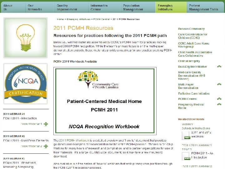 ASU Practicum in Primary Care § Used the CCNC PCMH workbook, webinars § https: //www. communitycarenc. org/emerging-initiatives/pcmh-central 1/2011 -pcmhresources/