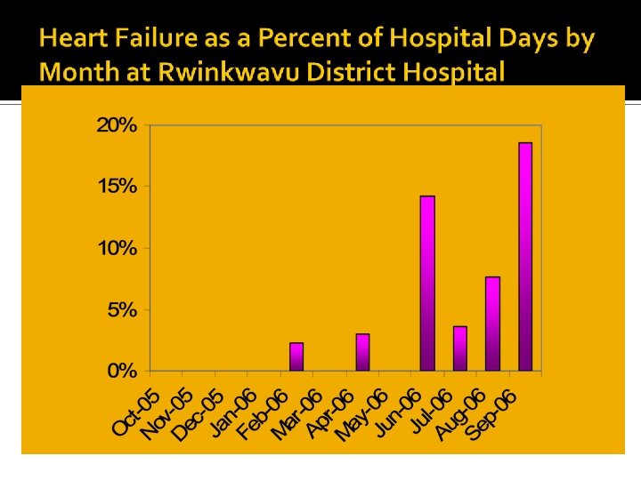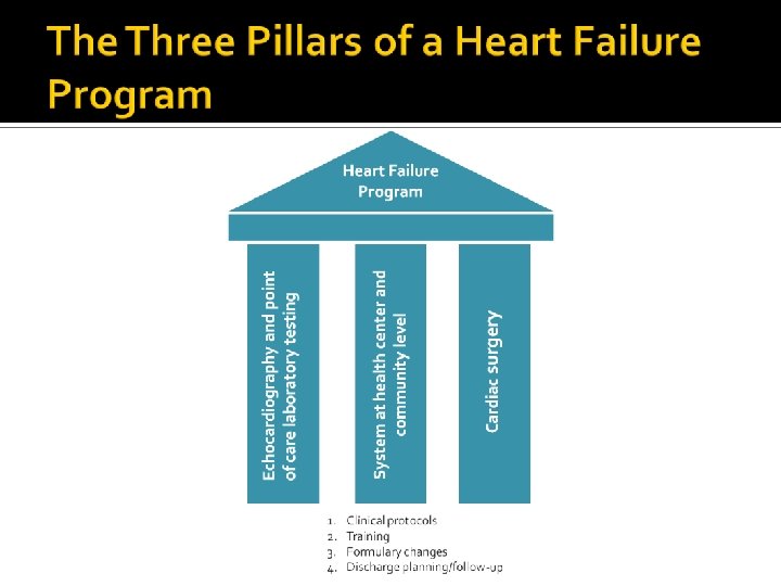 � How to scale-up a heart failure program at a national level? 1. 2. 3. 4. 5. 6. 7. Procurement of echocardiography equipment at district hospital level Procurement of point of care laboratory testing at district hospitals and health center level Formulary changes at district hospital and health center level Development and implementation of country-specific clinical protocols for district hospitals and rural health centers Development of training material and a training curriculum for physicians, nurses, and community health workers Development of a training model requiring 1 to 1 clinical mentorship and leading to official certification Partnership with Ministry of Health, National Medical School, and other stakeholders (i. e. Rwandan Heart Association)