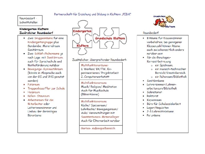 Partnerschaft für Erziehung und Bildung in Kluftern „PEBi. K“ zwischen der Grundschule Kluftern, den Kindergärten Kluftern/Efrizweiler und den Eltern - dringende Platz- und Raumbedarf des Kindergartens Kluftern, rückläufige Schülerzahlen an der GS Kluftern und die Erweiterung des Ganztagesbetriebs der Grundschule. - gemeinschaftliche Nutzung von vorgesehenen Funktionsräume im Kindergarten- und Ganztagesbetrieb der Schule: - Musikraum, Bewegungsraum, Experimentier- und Werkraum, Küche, Mensa, Toiletten, Besprechungsräume, Therapieräume, …