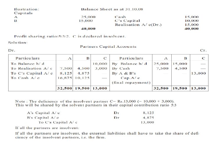 Garner Vs. Murray Rule : (The third partner who became insolvent was Mr. Wilkins) • The deficiency of the insolvent partner shall be taken over by the solvent partners. The following steps are taken: • (a) The loss on realisation shall be shared between all the partners (including the insolvent partner) in their profit-sharing ratio. • (b) The solvent partners shall bring in cash equal to the amount of loss suffered by them. • Cash A/c Dr. • To Solvent Partners Capital A/c • (c) The deficiency of the insolvent partner shall be taken over by the solvent partners in their capital contribution ratio ( fixed or fluctuating capitals) • Solvent Partners Capital A/c Dr. • To Insolvent Partner’s Capital A/c