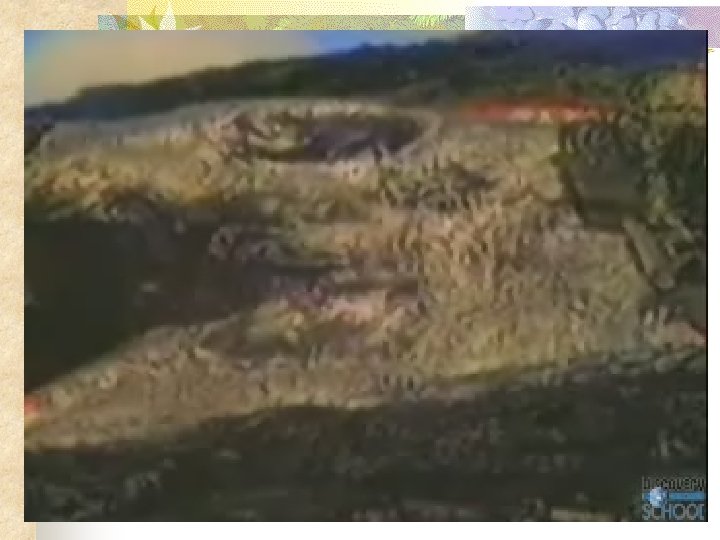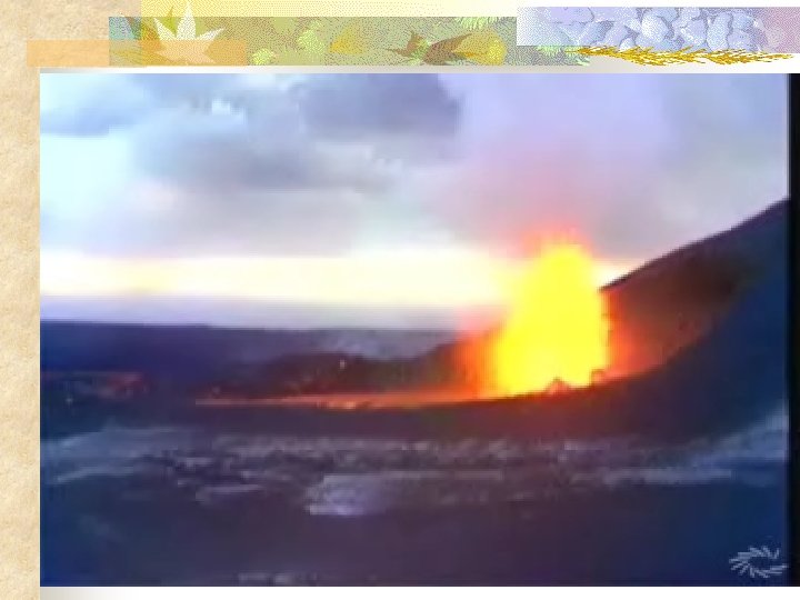 Parts of a Volcano n 1. Gas emission: various gases such as CO 2, H 2 O, nitrogen, and lesser gases such as chlorine, hydrogen, and argon. 2. Crater: depression connected to magma chamber via a pipe aka caldera 3. Lava: magma that has reached the surface 4. Rock 5. Vent or pipe: conduit that connects magma chamber to the crater 6. Magma chamber: area where magma accumulates within the n 7. Fumorale: vent that emits only gases n n n volcano