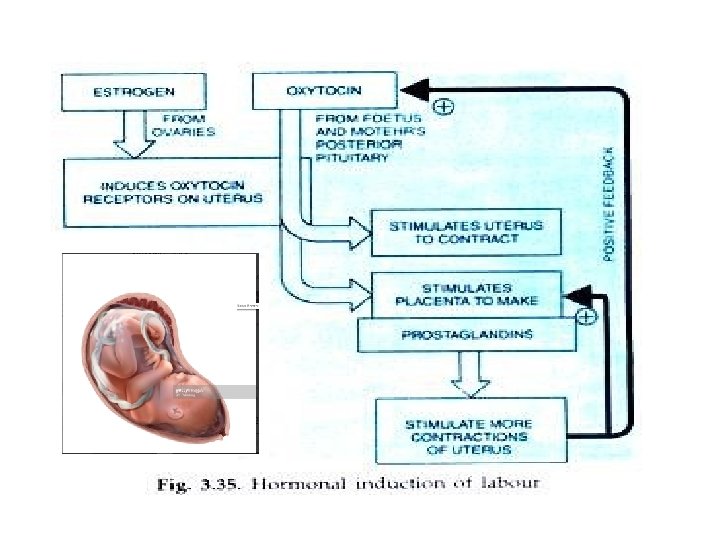 • The baby reorients, facing forward and down with the back or crown of the head engaging the cervix (uterine opening). • This causes the cervix to stretch, sending nerve impulses to the hypothalamus, which signals for the release of oxytocin from the posterior pituitary. • The oxytocin causes the smooth muscle in the uterine wall to contract. • The placenta releases prostaglandins into the uterus, increasing the contractions.