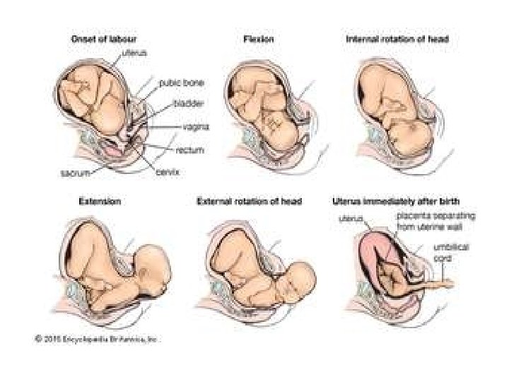 • Engagement of the foetal head in the transverse position. The baby's head is facing across the pelvis at one or other of the mother's hips • Descent and flexion of the foetal head. • Internal rotation. The foetal head rotates 90 degrees to the anterior position so that the baby's face is towards the mother's rectum • Delivery by extension. The foetal head is bowed, chin on chest, so that the back or crown of its head leads the way through the birth canal, until the back of its neck presses against the pubic bone and its chin leaves its chest, extending the neck—as if to look up, and the rest of its head passes out of the birth canal. • Restitution. The foetal head turns through 45 degrees to restore its normal relationship with the shoulders, which are still at an angle. • External rotation. The shoulders repeat the corkscrew movements of the head, which can be seen in the final movements of the foetal head.