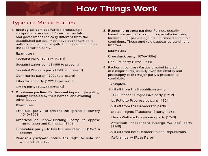 WHY HAS THE TWO-PARTY SYSTEM PERSISTED IN THE UNITED STATES? 1. Plurality System 2. Voter Opinion 3. State Laws Minor Parties • Ideological • One-issue • Economic-protest • Factional