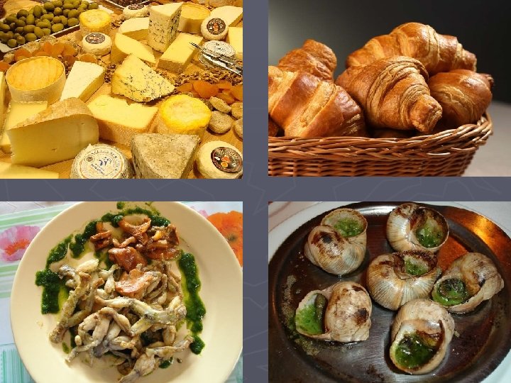 Jednym z symboli kuchni francuskiej są sery. Najsłynniejsze francuskie gatunki sera to: śmietankowy fromage blanc, brie i camembert n Popularnym pieczywem są bagietki oraz spożywane na śniadanie rogaliki croissanty. n Kuchnia ta słynie szczególnie z takich dań jak : żabie udka, ślimaki. n