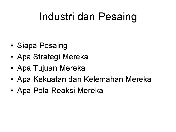 Industri dan Pesaing • • • Siapa Pesaing Apa Strategi Mereka Apa Tujuan Mereka Apa Kekuatan dan Kelemahan Mereka Apa Pola Reaksi Mereka
