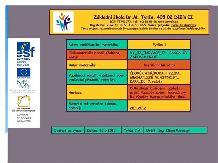 ZDROJE: Ø snímek č. 3 - Pajs, 2. 3. 2007, princip hydraulického lisu, cs. Wikipedia (licence Creative Commons), volné dílo http: //upload. wikimedia. org/wikipedia/commons/e/ed/Hydraulicky_lis. svg Ø Snímek č. 5 - Arencho, 2. 2. 2006 Power press animation, Wikipedia Commons, volné dílo http: //upload. wikimedia. org/wikipedia/commons/0/01/Power_press_animation. g if Ø Snímek č. 6 - Alfone 45, 28. 9. 2007, kotoučová brzda, licence Creative Commons, svobodná licence GNU, http: //upload. wikimedia. org/wikipedia/commons/2/2 c/Wikimust 02. jpg - Zdenek Lavička, 21. 11. 2008, schema kotoučové brzdy, Wikipedia Commons, volné dílo http: //upload. wikimedia. org/wikipedia/commons/6/62/Brzdi%C 4%8 Dka. jpg VY_32_INOVACE_17 - Pascalův zákon v praxi