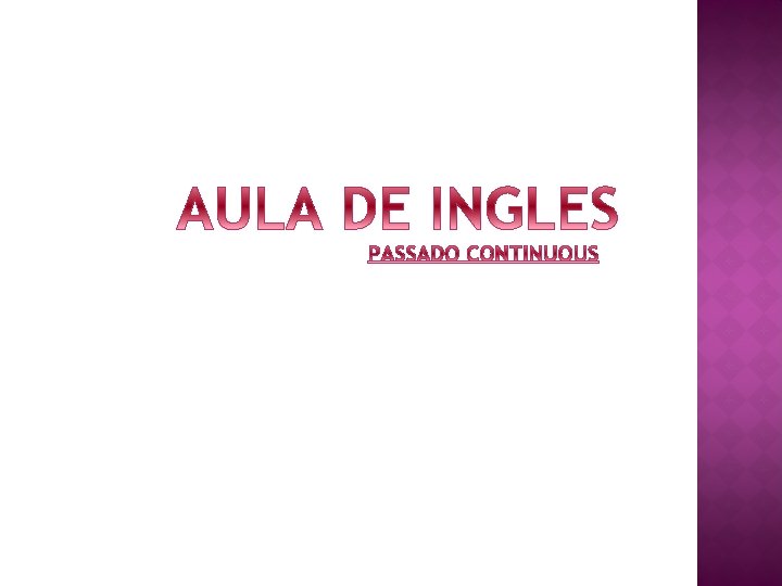 1) Segundo o estudo sobre “Past continuous”, qual das alternativas a seguir está nesse tempo verbal da língua inglesa? a) She was think his all day long. b) I'm studying for maths this morning. c) Maysa was playing video game when I left. d) We all were very confuse with this mess. e) My mother was cook some bread 2) Qual das alternativas apresenta a estrutura correta do “Past continuous”? a) verb to be (presente) + main verb + ing b) verb to be (past) + to + main verb c) verb to be (past) + main verb + ing d) verb to be (present) + to + ing e) verb to be (past) + ing 3) Complete as alternativas abaixo passando o verbo em parênteses para o “Past continuous”: a) I _________a very pleasant book last night. (to read) b) He _________ TV when his mother arrived. (to watch) c) My father and my little brother ___________ soccer yesterday. (to play) d) My mother __________lunch with her friends last week. (to have) e) They ___________hard in their College project. (to work)