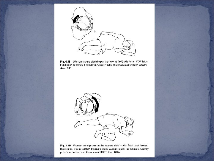 Matrenal Position and Movement Occiput posterior / asynclitism in first stage Try to determine position (LOP, ROP, or asynclitic) Time / maintenance Rotate baby: Deal with back pain - Positions - Knee–chest position - Pressure - Hands and Knee - Hydrotherapy - Pelvic rock - Tens - Lunge - I-D sterile H 2 O - Abdominal stroking - Cold / heat - Abdominal lifting - Walk / movement Monitoring fetal heart rate contraction - Avoid pushing arom I-V narcotics or epidural block Pitocin Time No progress or fetal distress Cesarean section Rotation and progress